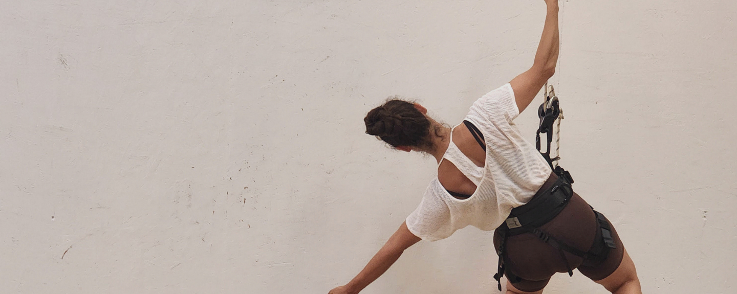 An invitation to activate body/space connections through breath, proprioception and presence integrating mindful practice and technique. Explore the center space with harness: slides, partner work, climbs and spirals.